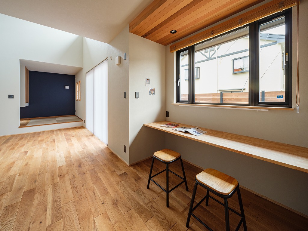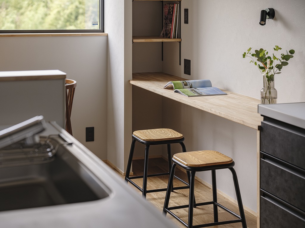 キッチンのすぐ横や、リビングのちょっとしたくぼみ(ニッチ空間)を利用して、木の温もりを感じる専用の学習スペースを作ります。