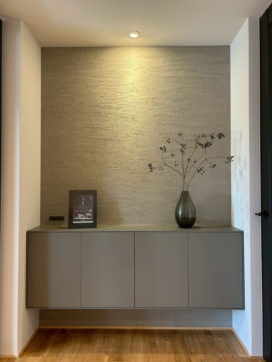 ジョリパット仕上げの壁面に灯りがやわらかく映り、陰影が美しく浮かぶ玄関ホール。