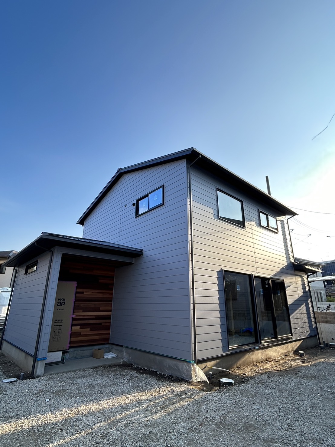 今月の写真は、先日に外部足場が解体されたガルバリウム鋼板の新築現場です。